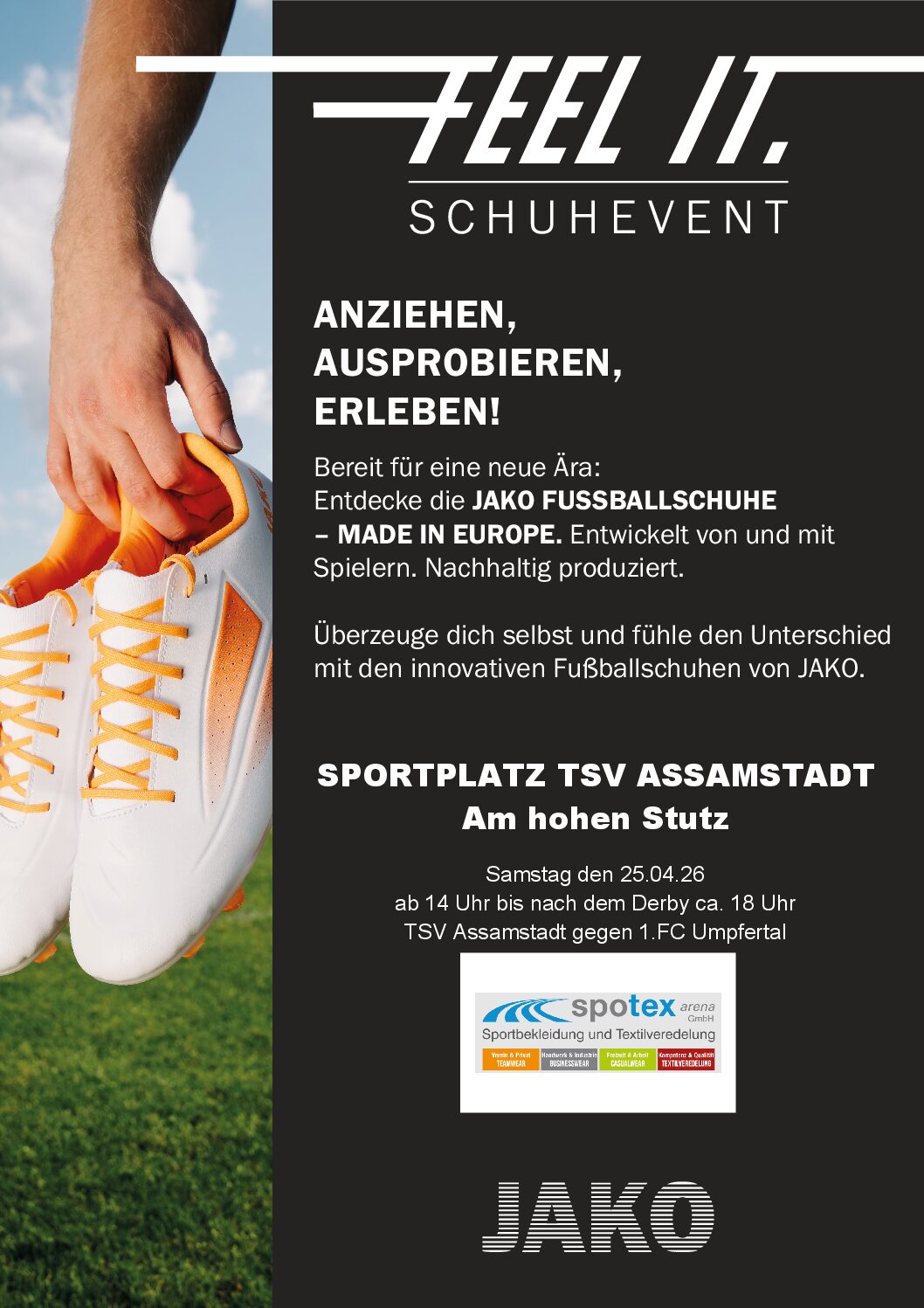 Beim Heimspiel unserer 1. Mannschaft gegen den 1. FC Umpfertal am Samstag, den 25.04.2026 gibt’s nicht nur Fußball-Action auf dem Platz: René Belz stellt die neuen JAKO-Fußballschuhe vor!